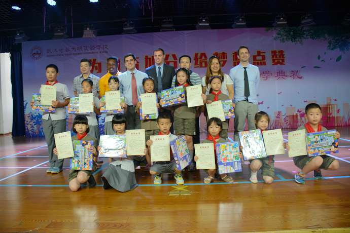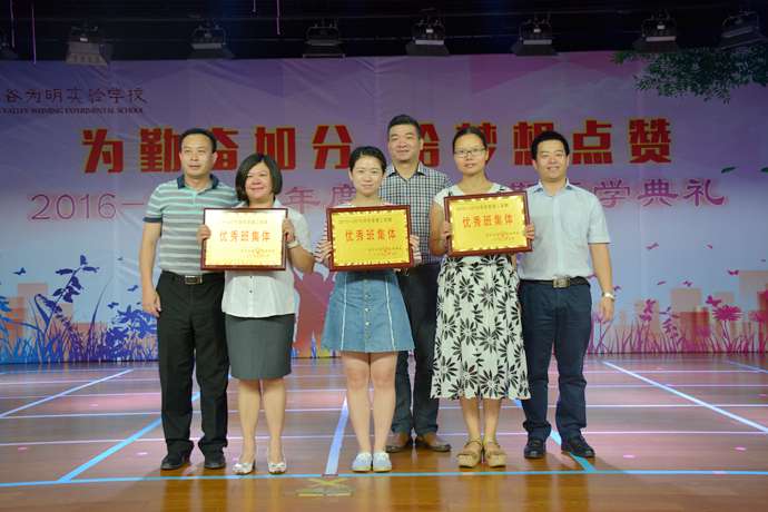 校园是个五彩的大舞台,每一个人都展示着自己独有的精彩。他们用自己的魅力感染着身边的每一个人。典礼中我们进行了“三好学生”、“优秀班干部”、“为明之星”的颁奖礼,共有48名同学获得了证书和礼品,还有现国三·1班、二·3班、五·1班获得优秀班集体称号,由黄校长、程主任、范主任以及外教老师共同为他们颁奖。