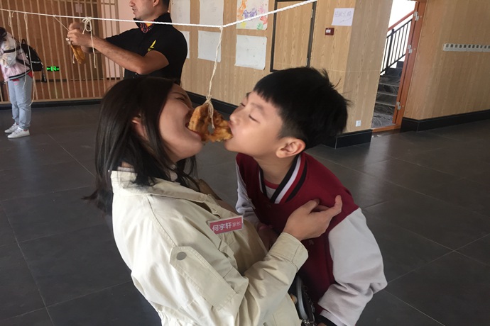 亲子合力吃掉悬挂空中的面窝。调皮的面窝在空中摇摆着,爸妈和宝贝们将头靠近,不断调整“吃姿”。终于同时咬住,大眼小眼四目相对笑了起来,你一口我一口吃掉来之不易的美味,留下甜蜜的记忆。