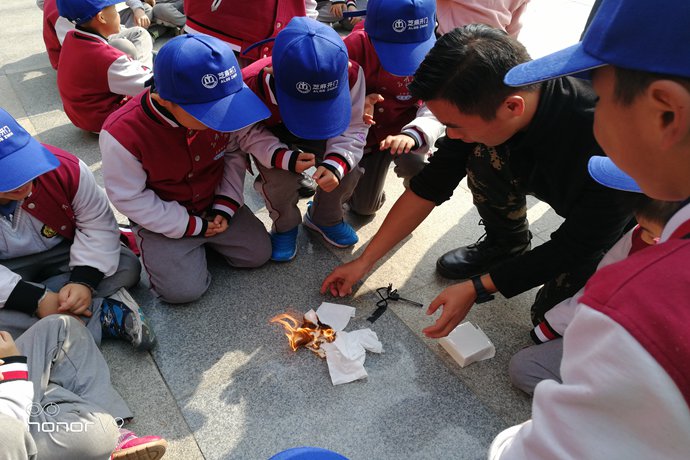 在户外生存“课堂”上,“钻木取火”是必学技能。看到教官谈话间就打出火花点燃纸巾,孩子们都跃跃欲试,迫不及待争相尝试。然而他们很快发现生火并不容易,需要摩擦得快而有力,还要保持这个频率才能点燃纸巾。但他们坚持不懈,轮番上阵,这次不行,下次再来!终于小小的火苗在干草上跳跃了起来,孩子们激动万分!此刻他们播种的是坚持,收获的是成功。