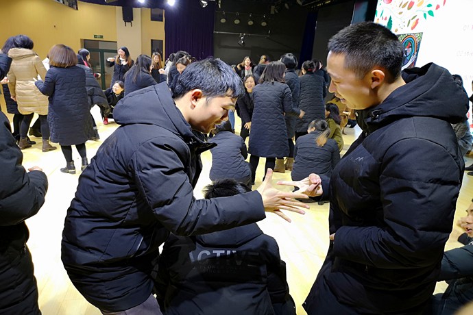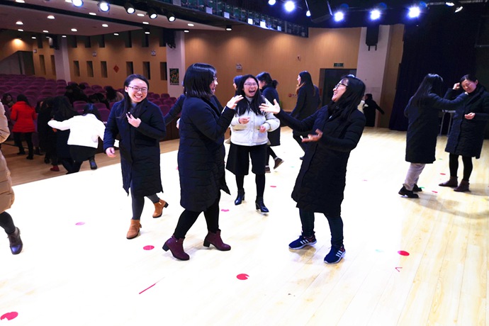 拍拍肩、捶捶背,轻快的音乐,不由自主的旋转运动,老师们笑声成片。两个经典的心理小游戏,帮助老师们卸下了劳累了一天的心理负担。