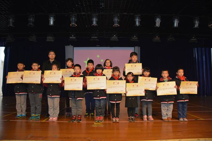 接下来由曹主任宣布本周德育常规评比结果,颁发上周获得为明之星和进步之星的班级,分别是:一(2)班、三(2)班;六(1)班、七(1)班;文明午休寝室:A402,B404;文明寝室:101、109。由一年级年级组长范小宝老师为获奖班级颁奖。